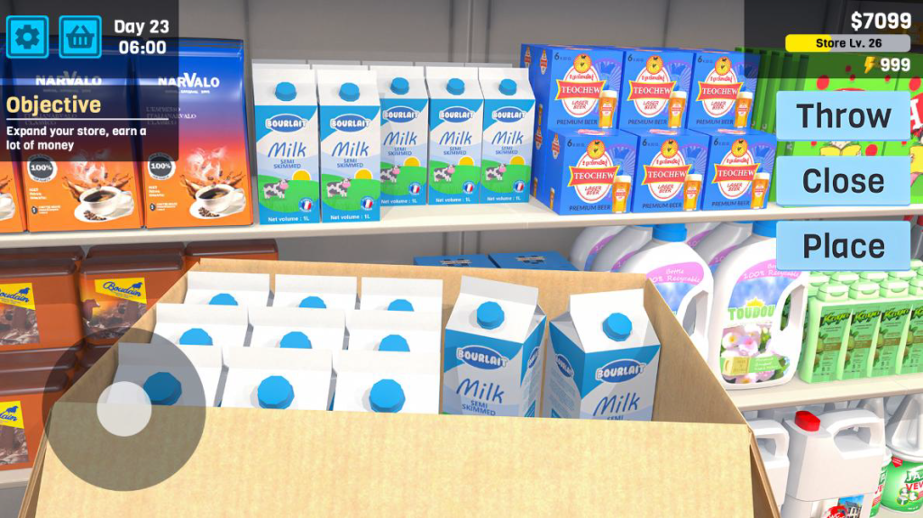 في اللعبة، أنت المسؤول الأول عن كل ما يخص المتجر . بتبدأ بتنظيم الأرفف، واختيار أماكن المنتجات، وتحديد الأسعار المناسبة، ثم تتعامل مع العملاء بشكل مباشر سواء في البيع أو عند الدفع .